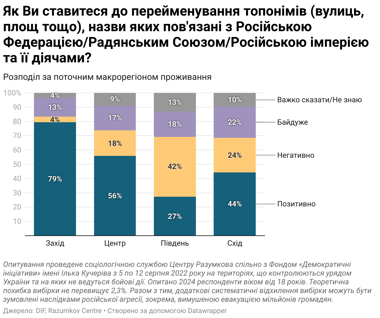 У східних областях, які не перебувають зараз під окупацією, більшість (44%) підтримує декомунізацію та дерусифікацію вулиць, проти виступає вдвічі менше респондентів (24%). У центральних та західних регіонах абсолютна більшість теж висловлюється за перейменування топонімів.