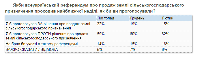 Загалом, протягом періоду з листопада 2019 до лютого 2020 року, частка прихильників продажу землі знижувалася наступним чином: 22% в листопаді, 19% - в грудні, 15% - в лютому.