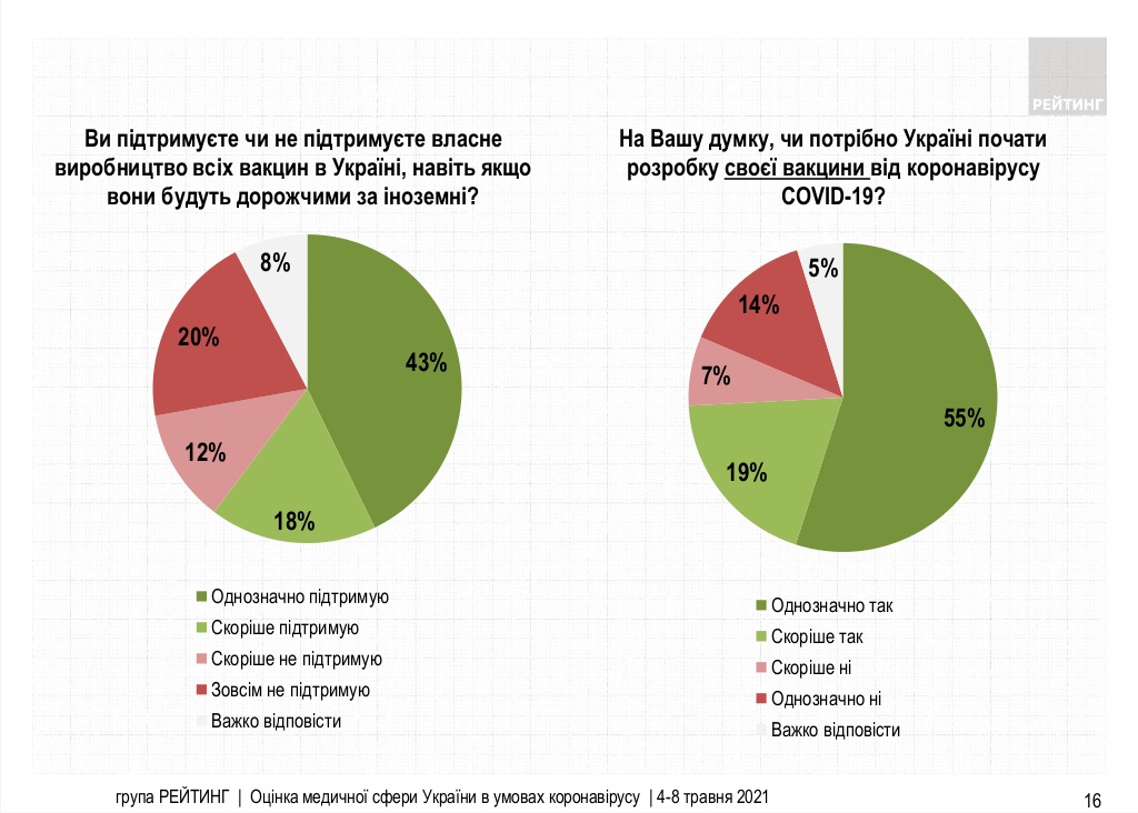 Також 74% респондентів вважають, що Україні потрібно почати розробку власної вакцини проти коронавірусу. Протилежної думки дотримуються 21%.
