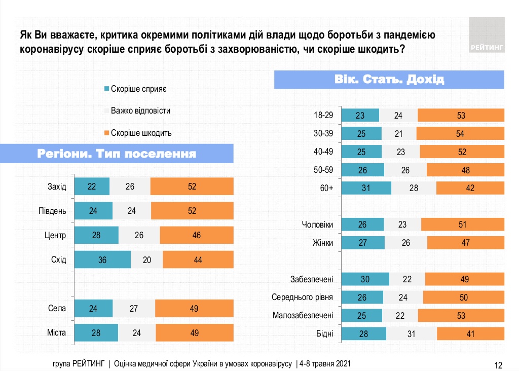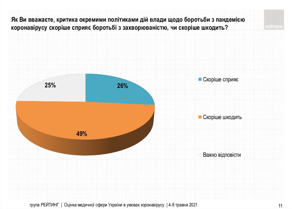 Думки про те, що критика окремими політиками дій влади щодо боротьби з пандемією коронавірусу скоріше шкодить боротьбі із COVID-19, притримуються 49% українців, йдеться в опитуванні Соціологічної групи “Рейтинг”. Навпаки вважають 26% опитаних.