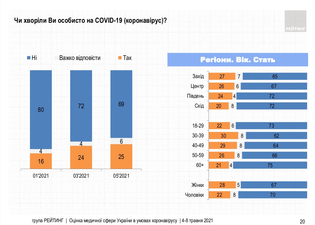 Про те, що особисто хворіли на COVID-19 розповіли 25% українців, а не хворіли – 69%. При цьому 64% з тих, хто перехворів, зверталися за допомогою до лікарів державних закладів охорони здоров’я з питанням лікування. Не зверталися до лікарів 36%.