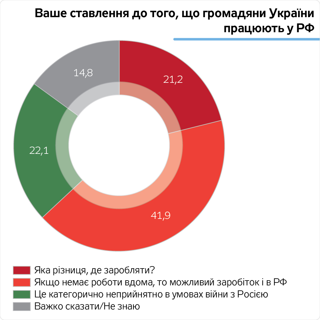 На питання про ставлення до трудової міграції в Росію, 41,9% українців відповіли, що робота в РФ - прийнятна річ, якщо вдома заробіток відсутній. Ще 21,2% обрали "філософський" варіант відповіді: "яка різниця, де заробляти?". Таким чином, виправдовують заробітчанство "в тилу ворога" сумарно - 63,1%. Мабуть, найбільш несподівана цифра, отримана в результаті опитування.