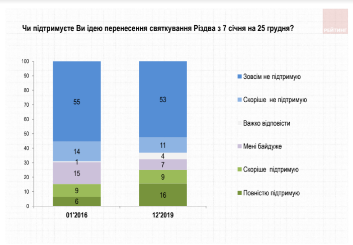 При цьому у 2016 році прихильників перенесення святкування Різдва було 15%, а проти цього виступали 69% українців. Найбільше тих, хто підтримує зміну дати святкування, живуть на Заході (43%). При цьому 45% громадян із західної України проти такої ідеї.