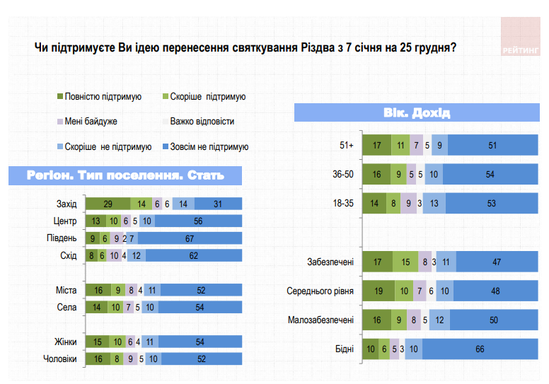 В інших регіонах українці скоріше проти перенесення святкування Різдва: у Центрі 23% – за і 66% – проти, на Півдні – 15% і 74% відповідно, на Сході – 14% і 74%. Серед тих, хто підтримує таку ініціативу більш забезпечені українці та громадяни середнього й старшого віку.