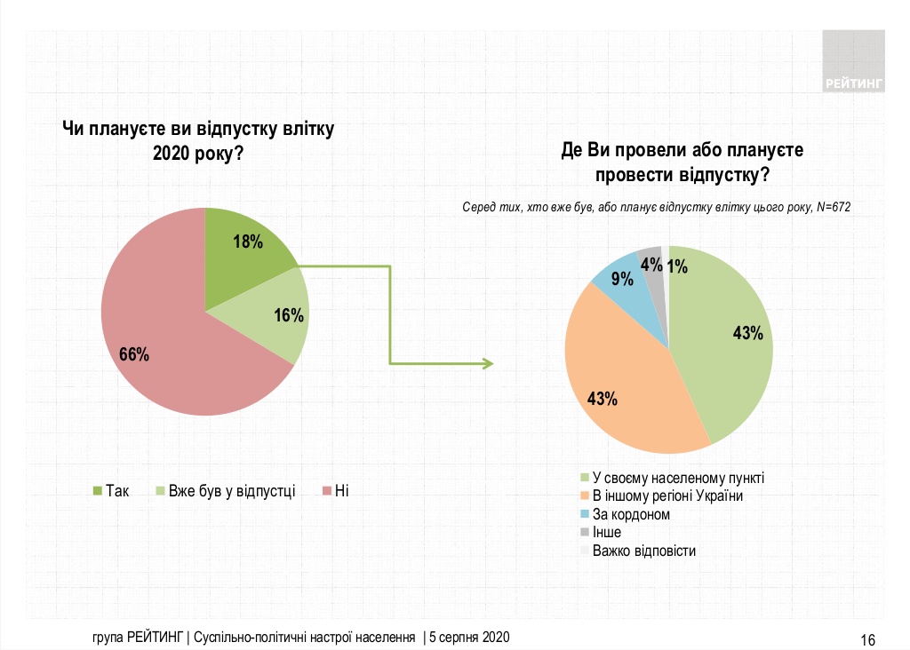 Водночас 66% громадян не планують та не були у відпустці. Серед тих, хто вже був у відпустці, або тільки планує її, 43% респондентів проводитимуть її у своєму населеному пункті. Стільки ж опитаних були у відпустці або планують її провести в іншому регіоні України.