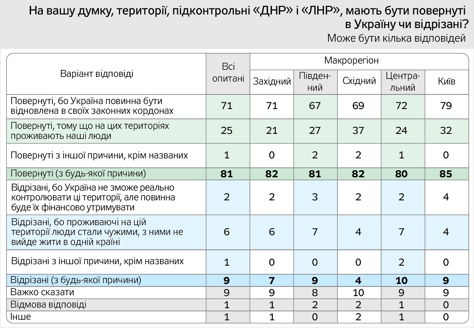 Тобто - війна за території, а не за людей? Від такого категоричного висновку утримують наступні цифри: тільки 6% вважають, що неконтрольовані території мають бути відрізані, оскільки люди, які проживають на них, стали чужими, і жити з ними в одній країні не вийде.