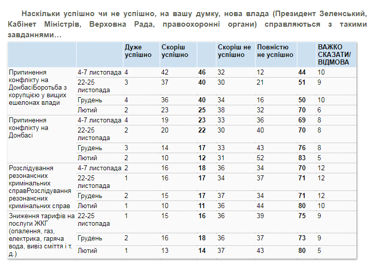 Успішними дії влади щодо вирішення збройного конфлікту в Донбасі вважають 25% українців, а неуспішними – 70%, йдеться в опитуванні Київського міжнародного інституту соціології (КМІС). У грудні успішність влади у цьому питанні відзначали 40% опитаних, неуспішність – 50%.