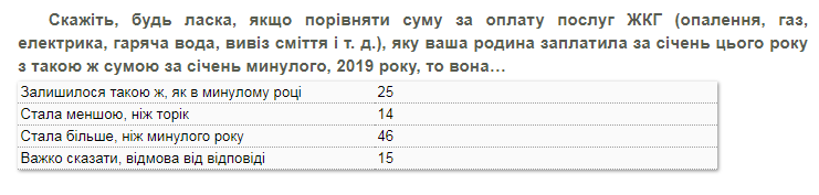 При цьому 46% опитаних зазначили, що вони у січні 2020 року витратили на оплату "комуналки" більше коштів, ніж у січні минулого року. У 39% українців ці витрати не змінилися або зменшилися.