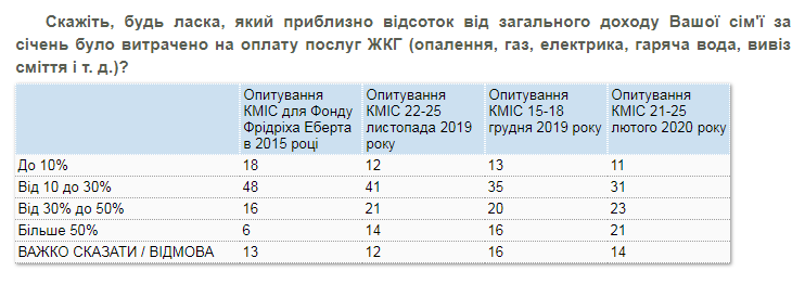 Ще 21% учасників опитування вказав на те, що витрачає на оплату послуг ЖКГ більшу половину доходу сім'ї. Ця частка зросла у порівнянні з опитуваннями КМІС листопада-грудня минулого року (тоді було 14% і 16% відповідно).