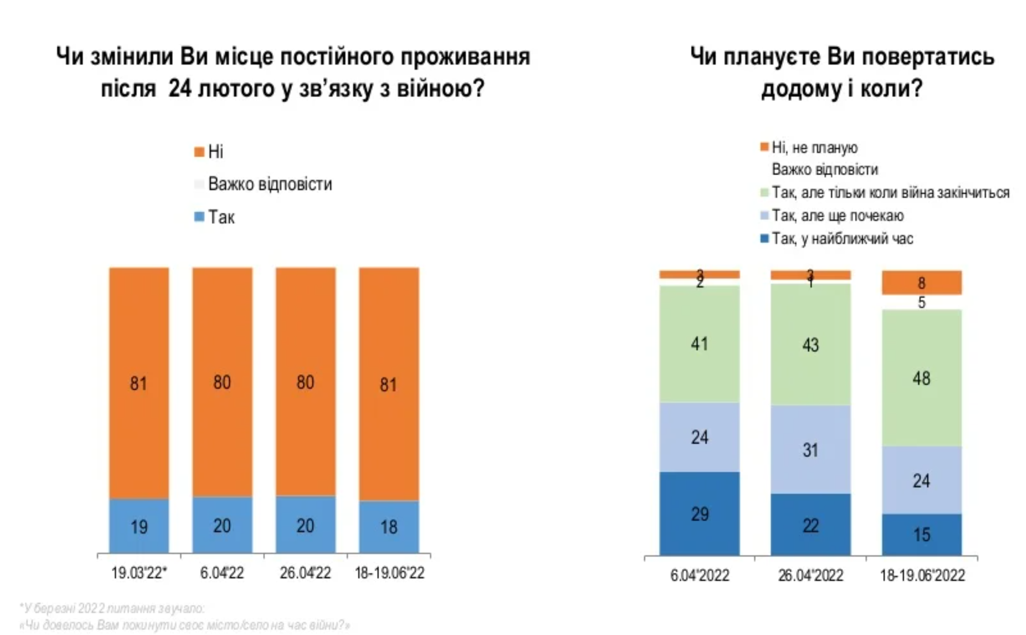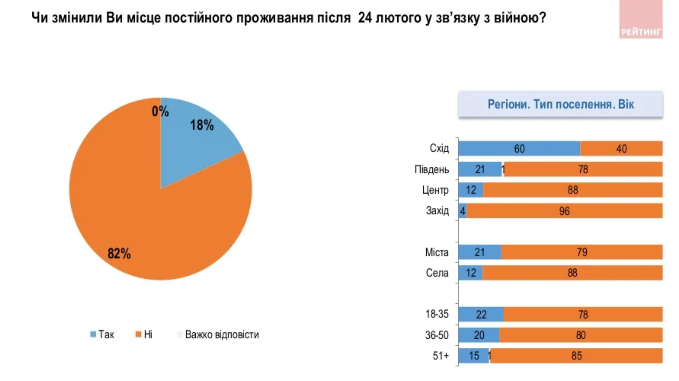 Соціологи зазначають, що кількість респондентів, які змушені були покинути місце постійного проживання з 24 лютого 2022 року, практично залишається незмінною. Водночас зменшується число переселенці з центральних регіонів, але зростає кількість внутрішньо переміщених осіб зі східних та південних.