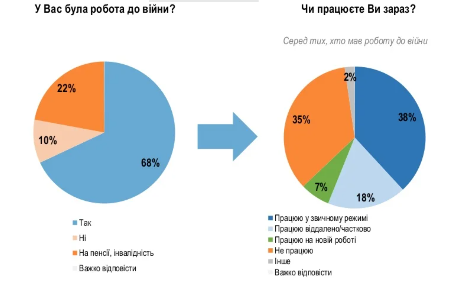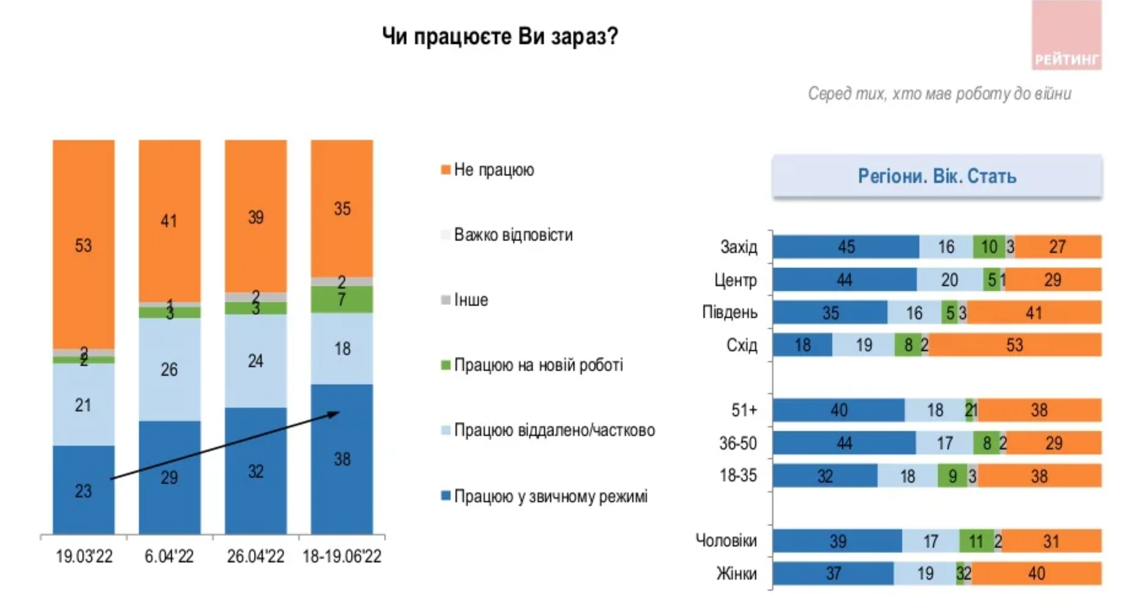 Також продовжується поступове повернення громадян до місць роботи: 38% з тих, хто працював до війни, повернулися на свої робочі місця у звичному режимі, 18% – працюють дистанційно, 7% – знайшли нове місце праці. Водночас третина опитаних до цього часу не працюють.