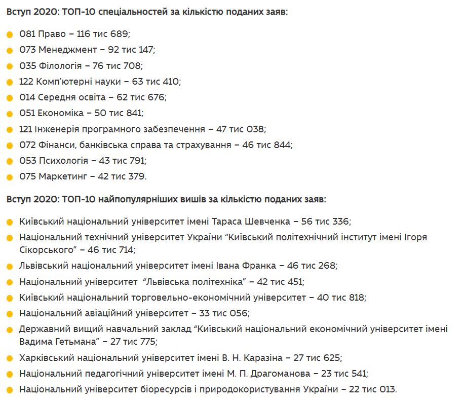 Також Міносвіти публікує ТОП за обраними спеціальностями та рейтинг ВНЗ за кількістю поданих заяв.