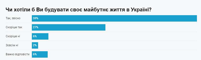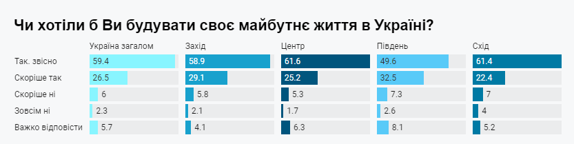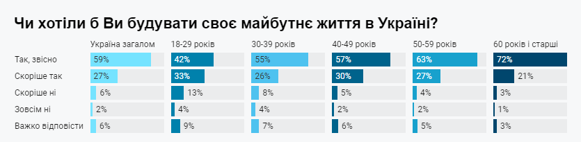 І хоча бажання жити в Україні переважає в усіх вікових групах, із віком налаштованість залишатися в Україні зростає. Так, якщо серед молоді будувати майбутнє в Україні хочуть 74%, серед респондентів 30–39 років – вже 81%, 40–49 років – 87%, 50–59 років – 90%, і серед найстаршої групи – 93%.