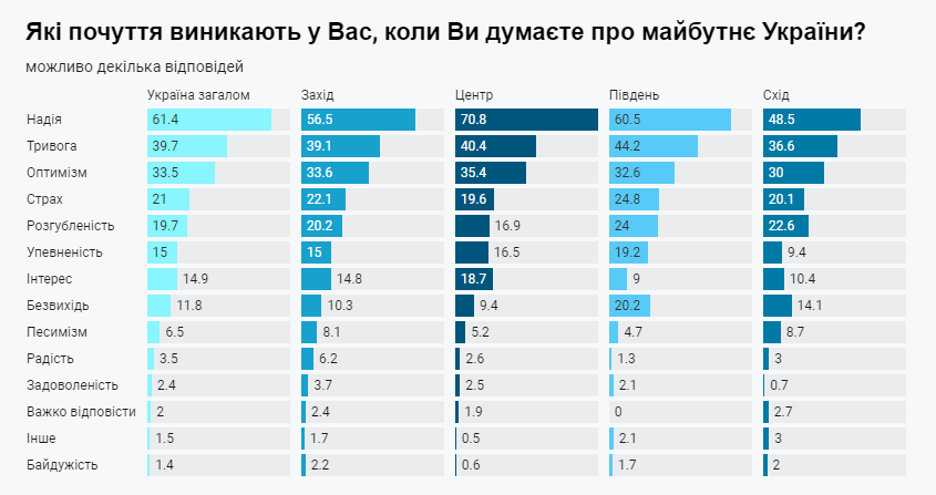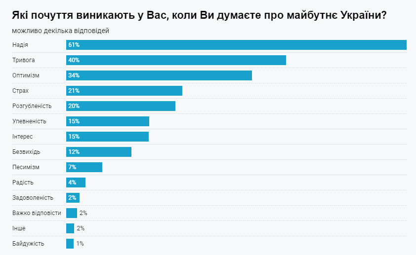 Серед почуттів, які опитані відчувають стосовно майбутнього України, у 61% переважає надія, на другому місці тривога – у 40%, та оптимізм – у 33,5%.