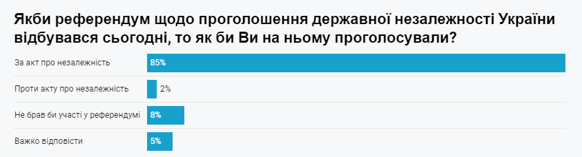 Абсолютна більшість громадян, а саме 85%, підтримали б незалежність України, якби референдум щодо проголошення державної незалежності України відбувався сьогодні. Такі дані соціологічного опитування оприлюднив Фонд «Демократичні ініціативи» імені Ілька Кучеріва спільно з соціологічною службою Центру Разумкова.