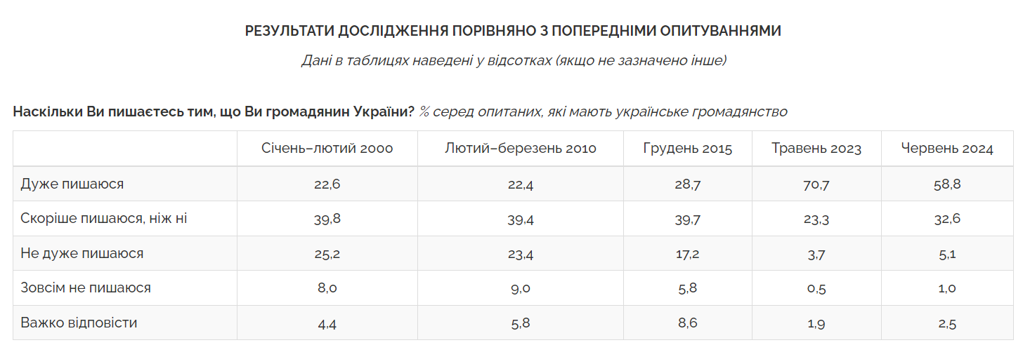 Також за останні 18 років, із 2006 року, в Україні значно зросла частка людей, які насамперед ототожнюють себе з Україною – з 31% до 53%. Натомість з 44% до 28% зменшилася частка тих, хто найбільше пов'язаний зі своїм містом чи селом.