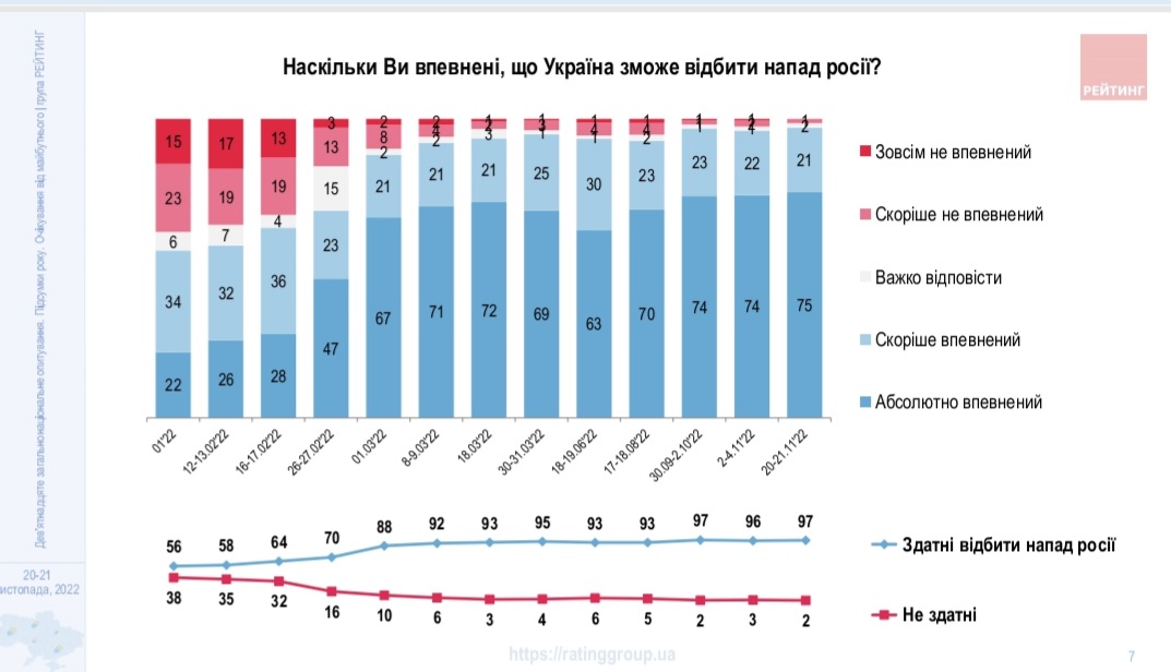 Абсолютна більшість опитаних (97%) впевнена, що Україна зможе відбити напад РФ, свідчать дані соціологічного опитування групи "Рейтинг" , яке проводилось 20-21 листопада 2022 року.