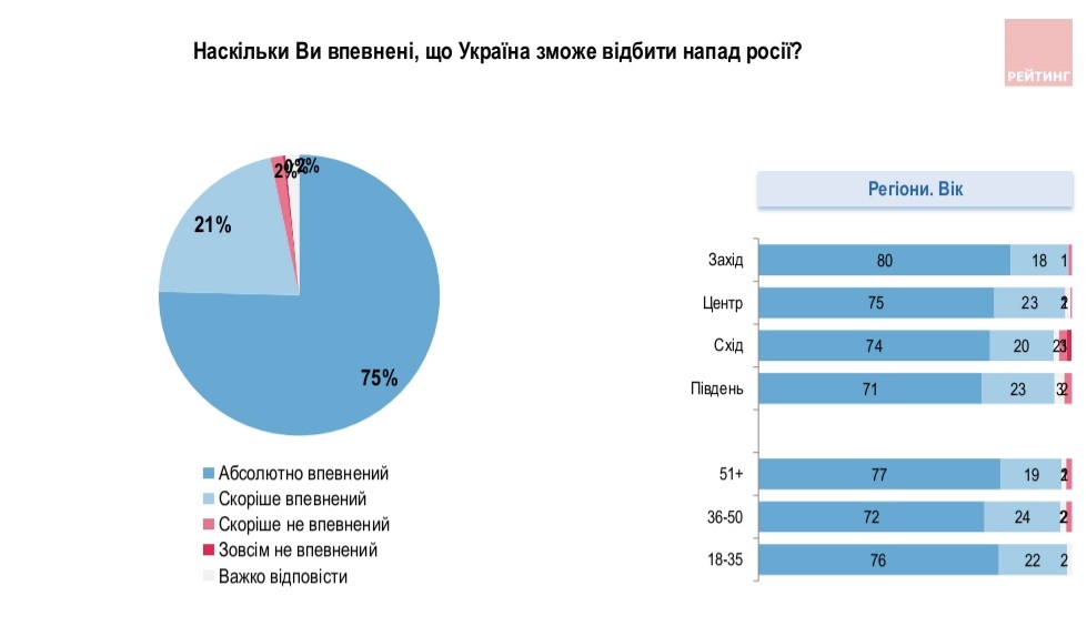 Зокрема, 75% абсоютно впевнені в цьому та 21% - скоріше впевнені. На заході країни 80% респондентів впевнені у здатності України відбити напад, у центрі - 75%, на сході - 74% та на півдні - 71% опитуваних.