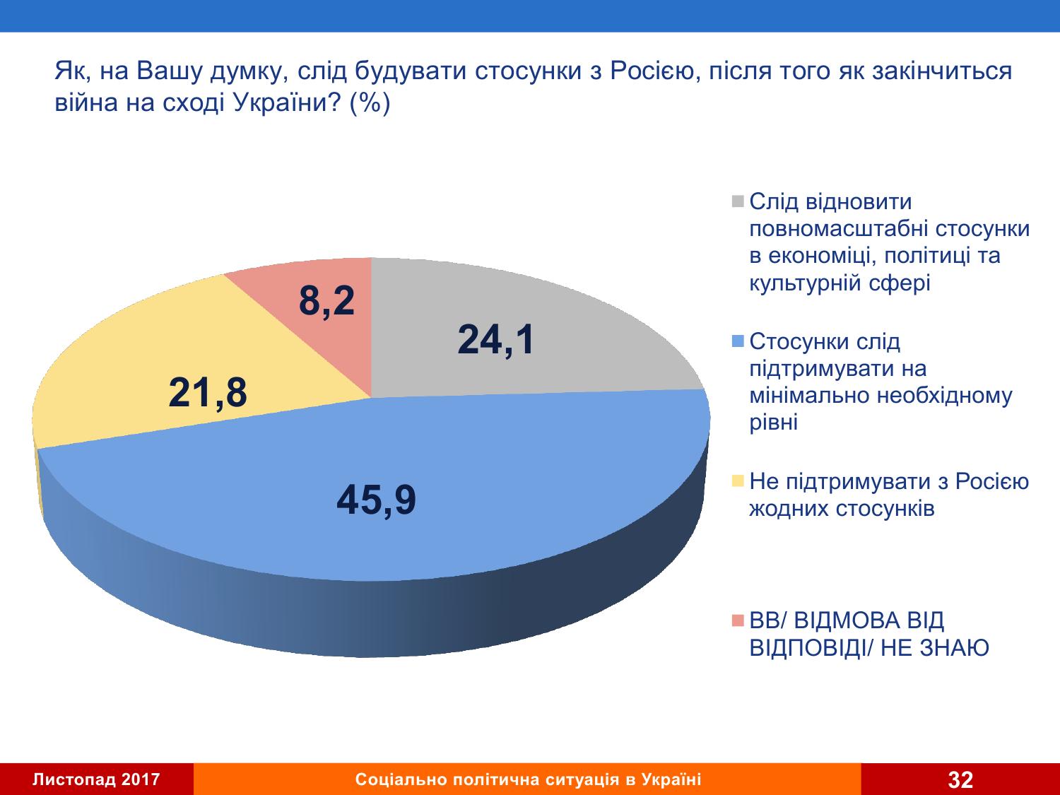 Як свідчать дані опитування КМІС, у вересні 2017 року кількість українців, які вважають, що відносини з Росією повинні бути з закритими кордонами, візами, митницями, зросла до 49% (у травні було 43%).