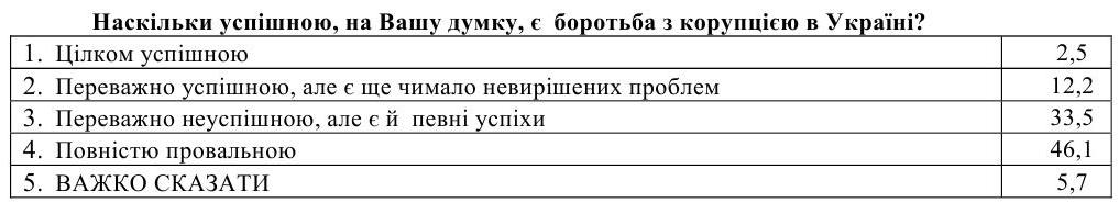 Успішність у боротьбі з корупцією вбачають 15%, причому лише 2,5% оцінюють цю боротьбу як цілковито успішну.