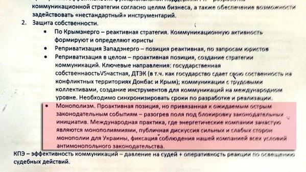 Документ складається з чотирьох модулів, що описують стратегію захисту інтересів ДТЕК і тактичні кроки в період з січня по травень поточного року. Дедлайни деяких заходів, наведених у документі, заплановані на липень-серпень. Між тим, велика частина заходів вже повинна бути виконана.