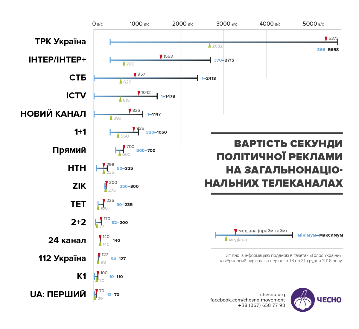 Під час президентської кампанії за політичну рекламу кандидатам найдорожче доведеться заплатити за вечірній прайм-тайм, найменше – за ефір після опівночі. При цьому найдорожчу рекламу транслюють канали з найвищими рейтингами, серед яких лідирує телеканал ТРК "Україна", далі йдуть "1+1" та "Інтер". Як зазначають у громадському русі "Чесно", оприлюднені прайси телеканалів на рекламу дають змогу перевірити, чи зазначають партії у своїх звітах реальні витрати на рекламу.