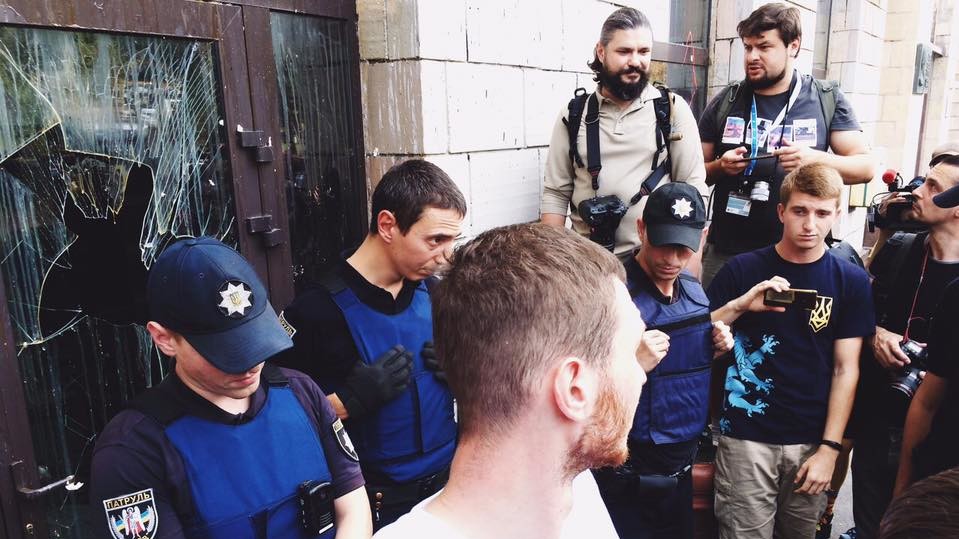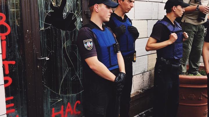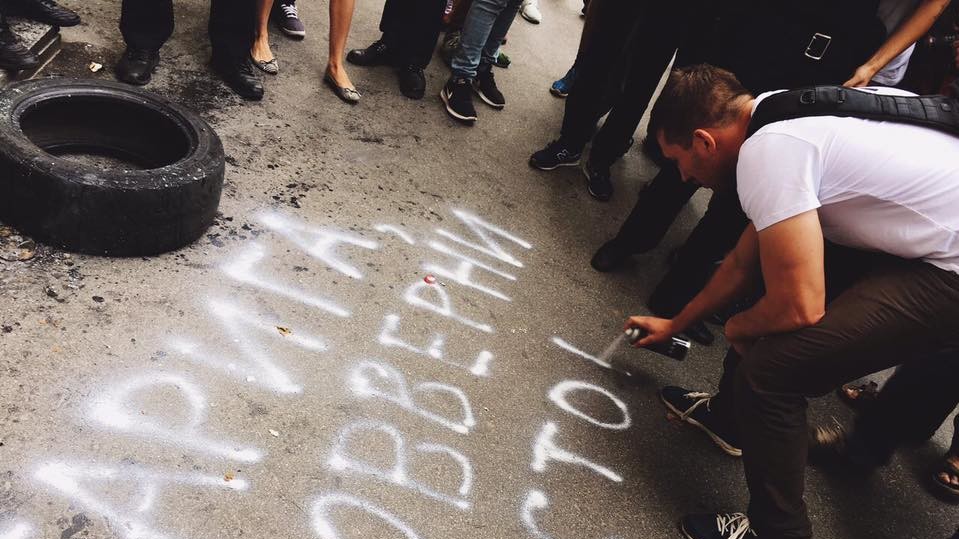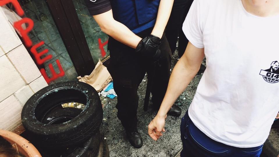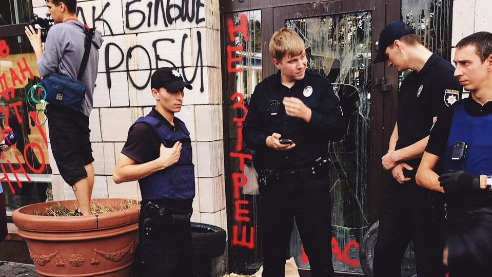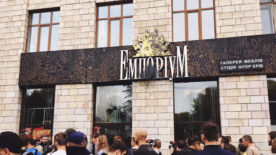 Група активістів розбила вітрини, а також списала гаслами фасад магазину меблів Emporium, власники якого знищили графіті часів Революції Гідності – портрети" "євромайданівців" Тараса Шевченка, Івана Франка та Лесі Українки.