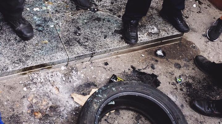 На одній з уцілілих вітрин зробили напис "Тут був Майдан, і тут він буде вічно". До стін будівлі також принесли шини. На місце інциденту прибула патрульна поліція.