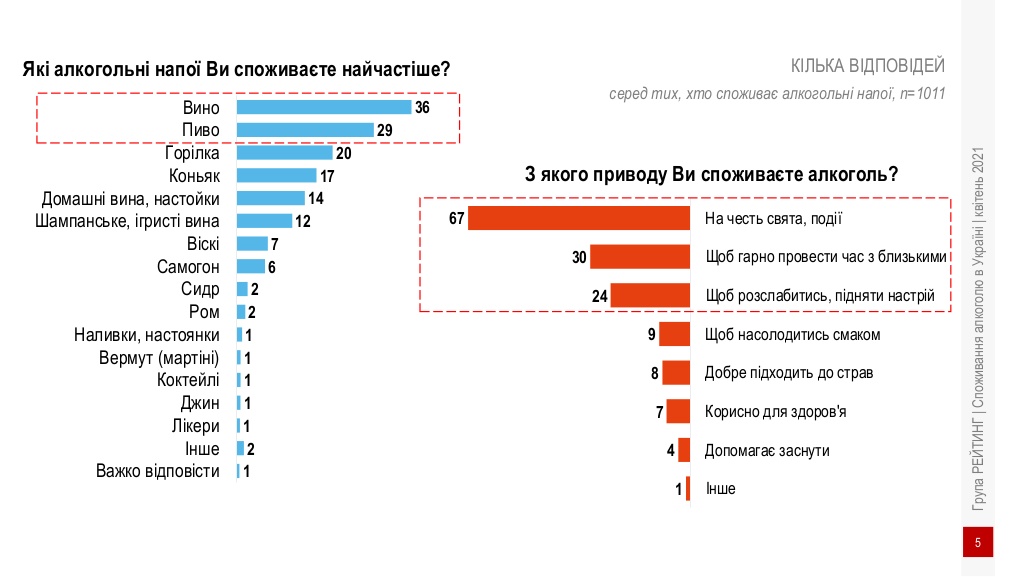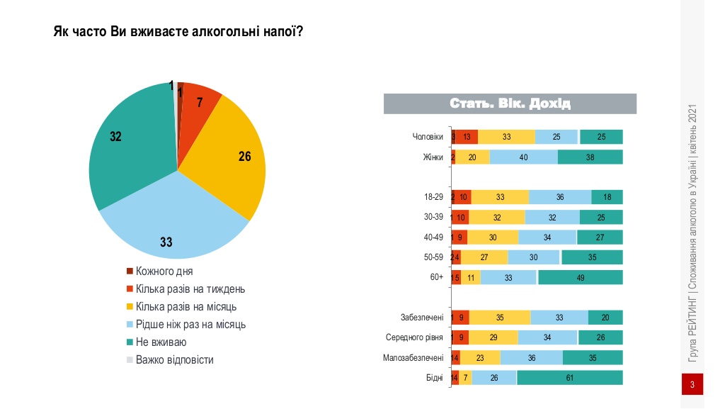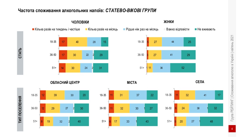 За даними соціологів, частіше вживають алкоголь чоловіки, люди середнього віку та більш забезпечені українці. Водночас у розрізі статево-вікових груп чоловіки в будь-якому віці споживають алкоголь частіше, ніж жінки. Своєю чергою молодь частіше вживає алкогольні напої, незалежно від типу поселення. У містах молодь і люди середнього віку вживають алкоголь однаковою мірою.