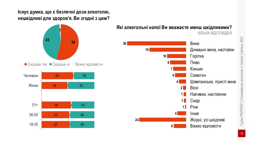 Менш шкідливими алкогольними напоями кожен третій респондент назвав вино, кожен п’ятий – домашні вина. Лише 10% опитаних вважають, що менш шкідливим алкоголем є горілка, 8% - пиво, 6-7% - коньяк та самогон. Водночас чверть українців переконані, що усі алкогольні напої шкідливі.