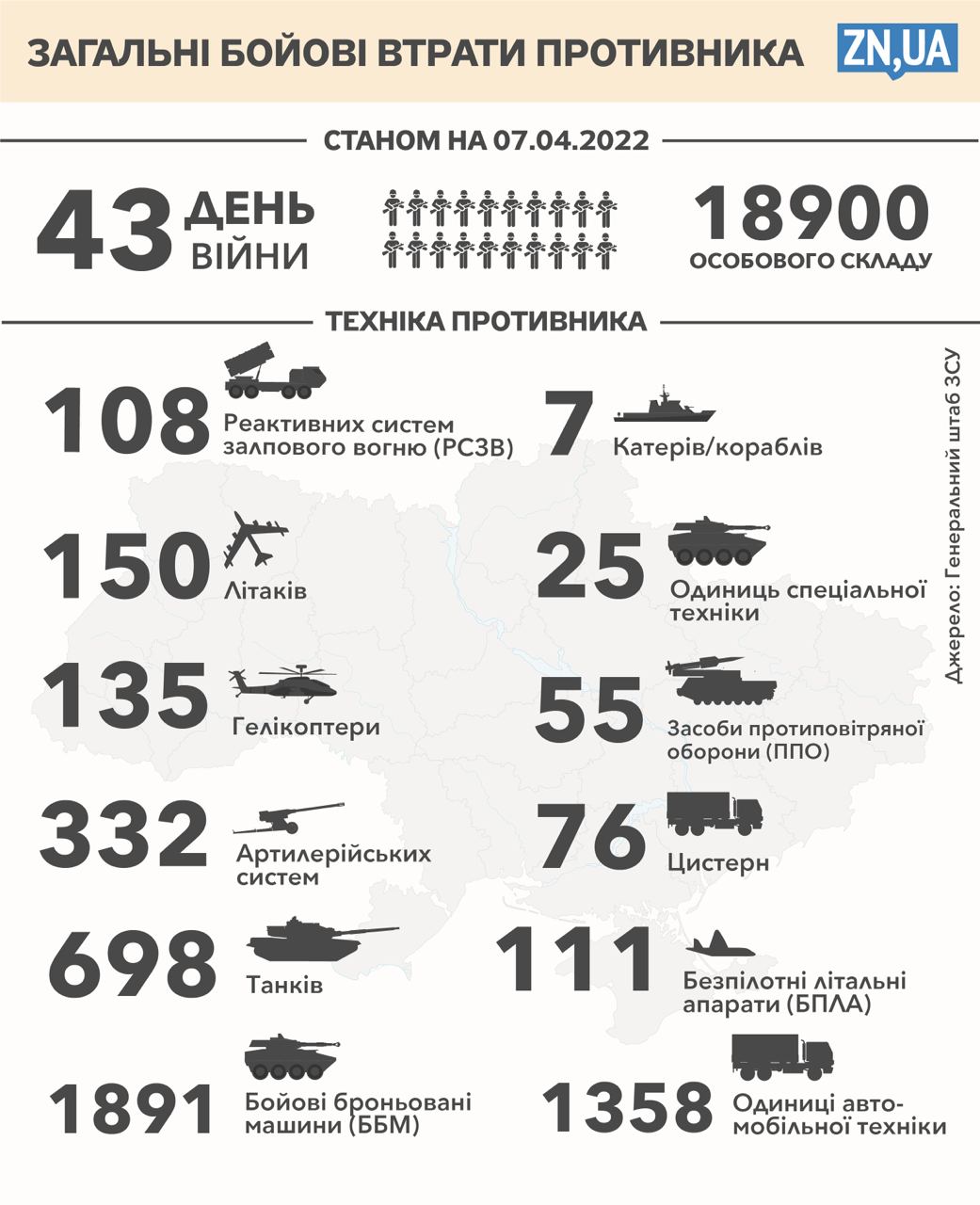 Загальні бойові втрати ворога з 24.02 по 06.04 орієнтовно склали: