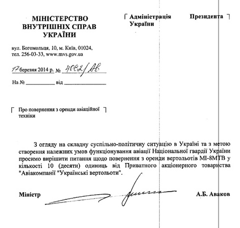 Також міністр просить передати Нацгвардії 4 літаки Ан-32 "Б" держпідприємства "Антонов". Окрім цього, Аваков пропонує повернути з оренди 10 вертольотів МІ-8МТВ, які зараз знаходяться в користуванні ВАТ "Авіакомпанії" Українські вертольоти". У Державної прикордонної служби пропонується взяти 1 літак АН-72.