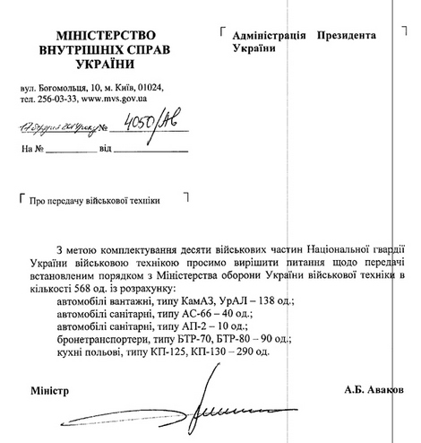 Міністерство внутрішніх справ звернулося до адміністрації президента з проханням забезпечити Національну гвардію України військовою, авіаційною і автомобільною технікою. Про це йдеться у листах голови МВС в адміністрацію президента.