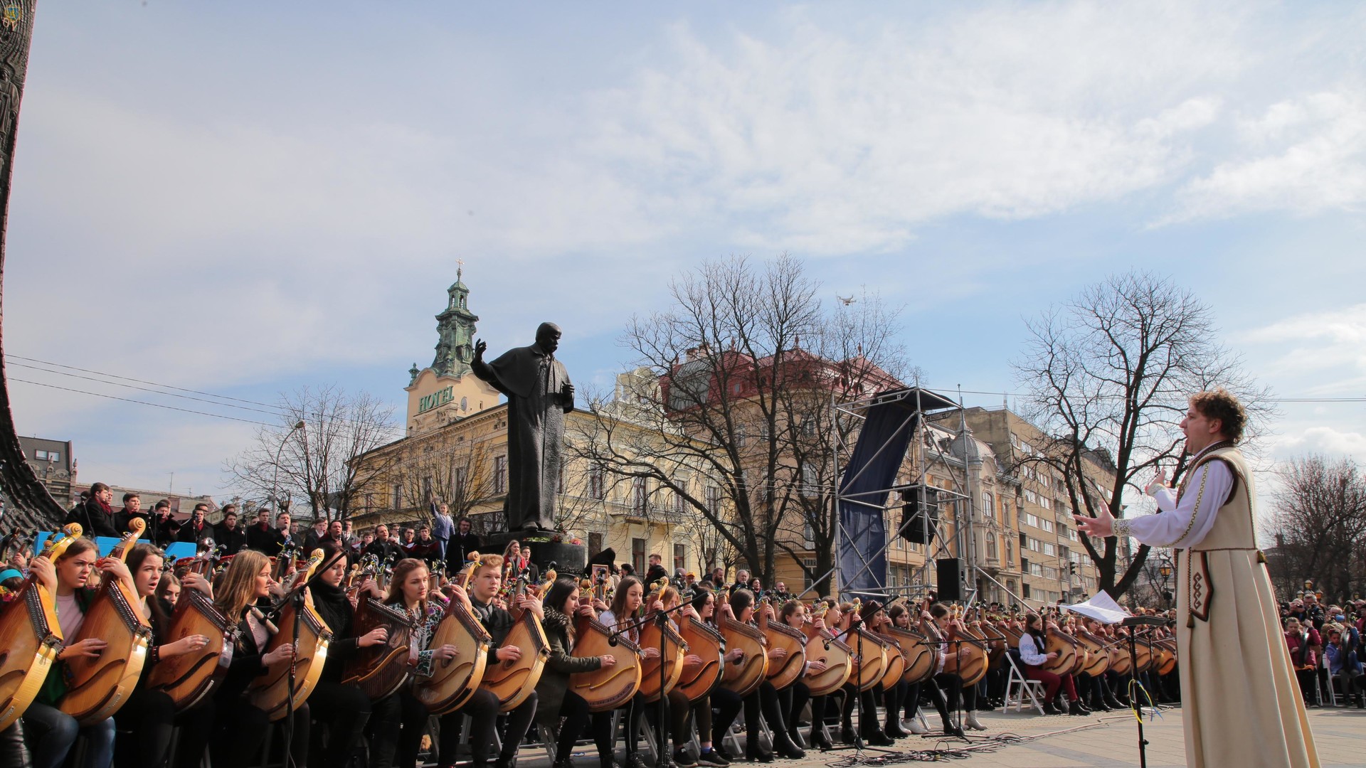 У Львові бандуристи виконали "Заповіт" і "Реве та стогне Дніпр широкий". Партитури для проекту написав відомий український композитор Іван Небесний.