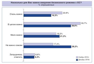 У листопаді 2015 року, коли також очікувалося, що безвізовий режим буде надано з дня на день, дуже важливим його називали 23%, респондентів, в цілому важливим – 34%, мало важливим або зовсім не важливим – 37%, вагалися з відповіддю - 6%.