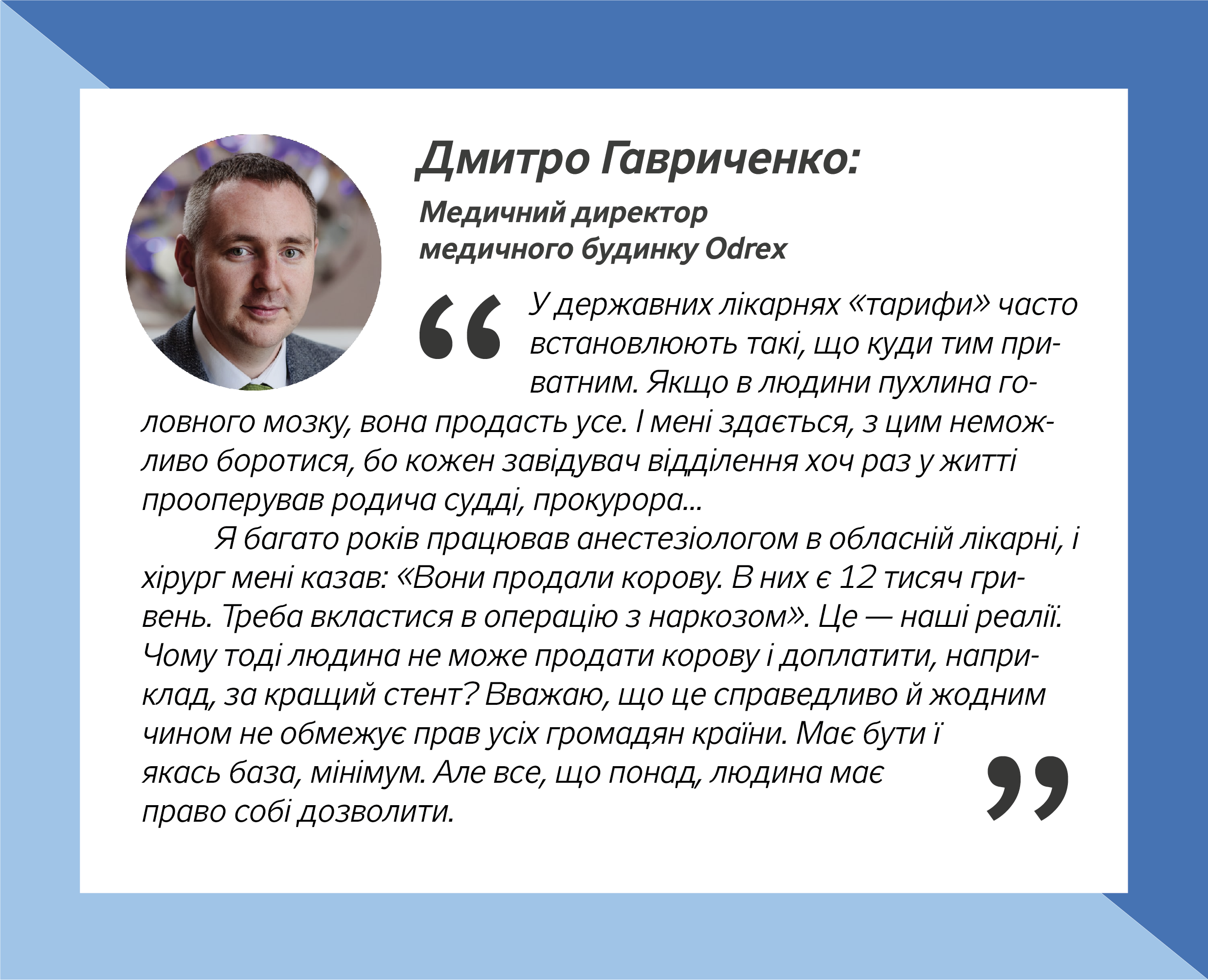 Медичний директор медичного будинку Odrex Дмитро Гавриченко нагадує, що в державних лікарнях «тарифи» часто набагато вищі за приватні. Тому має бути мінімальна база послуг, але все, що понад, людина має право собі дозволити.