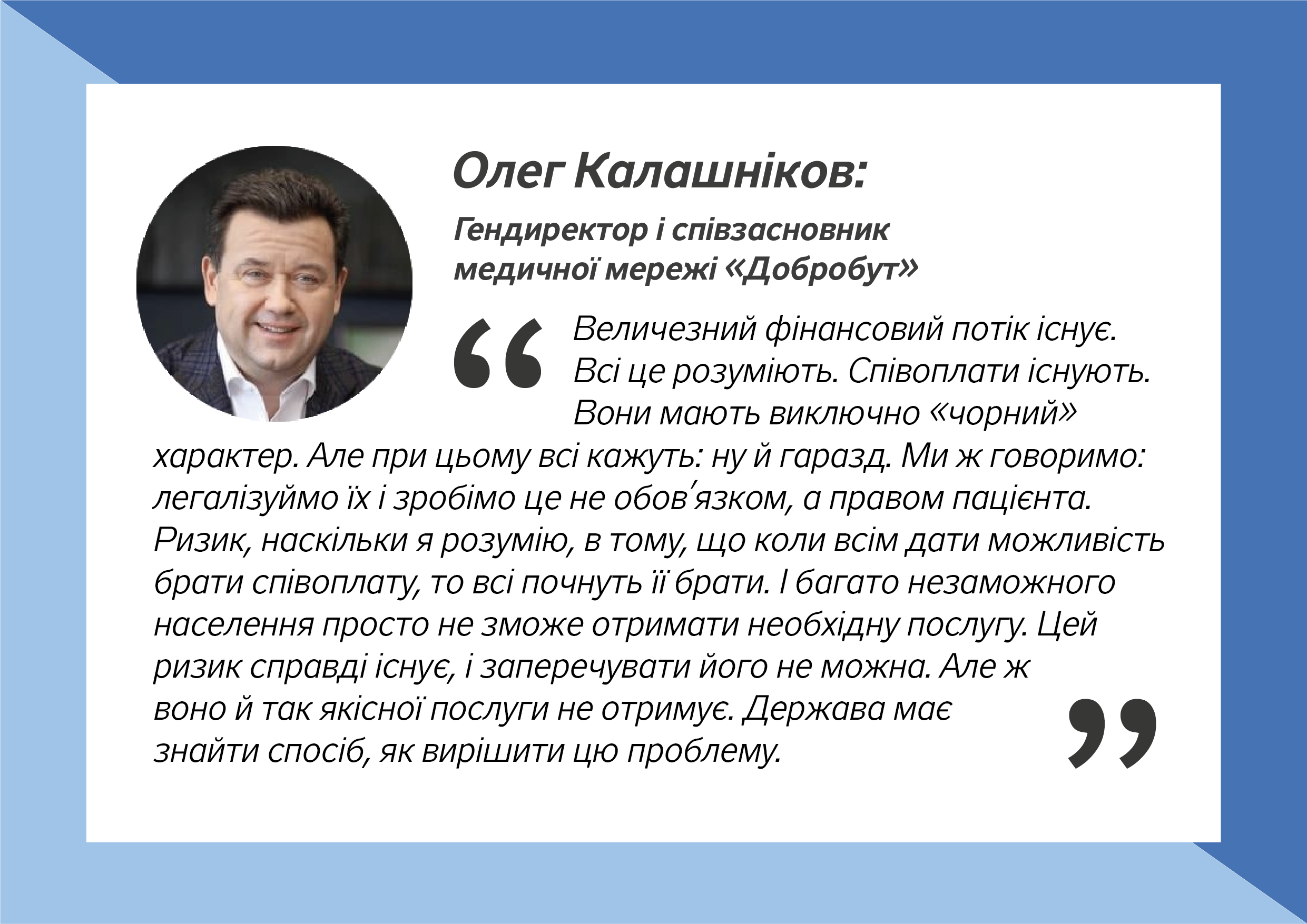 Співоплати ввести простіше і легше, ніж закрити 70% неефективних лікарень, вважає гендиректор і співзасновник медичної мережі «Добробут» Олег Калашніков. Але такий непопулярний крок поставить хрест на кар'єрі будь-якого українського політика.