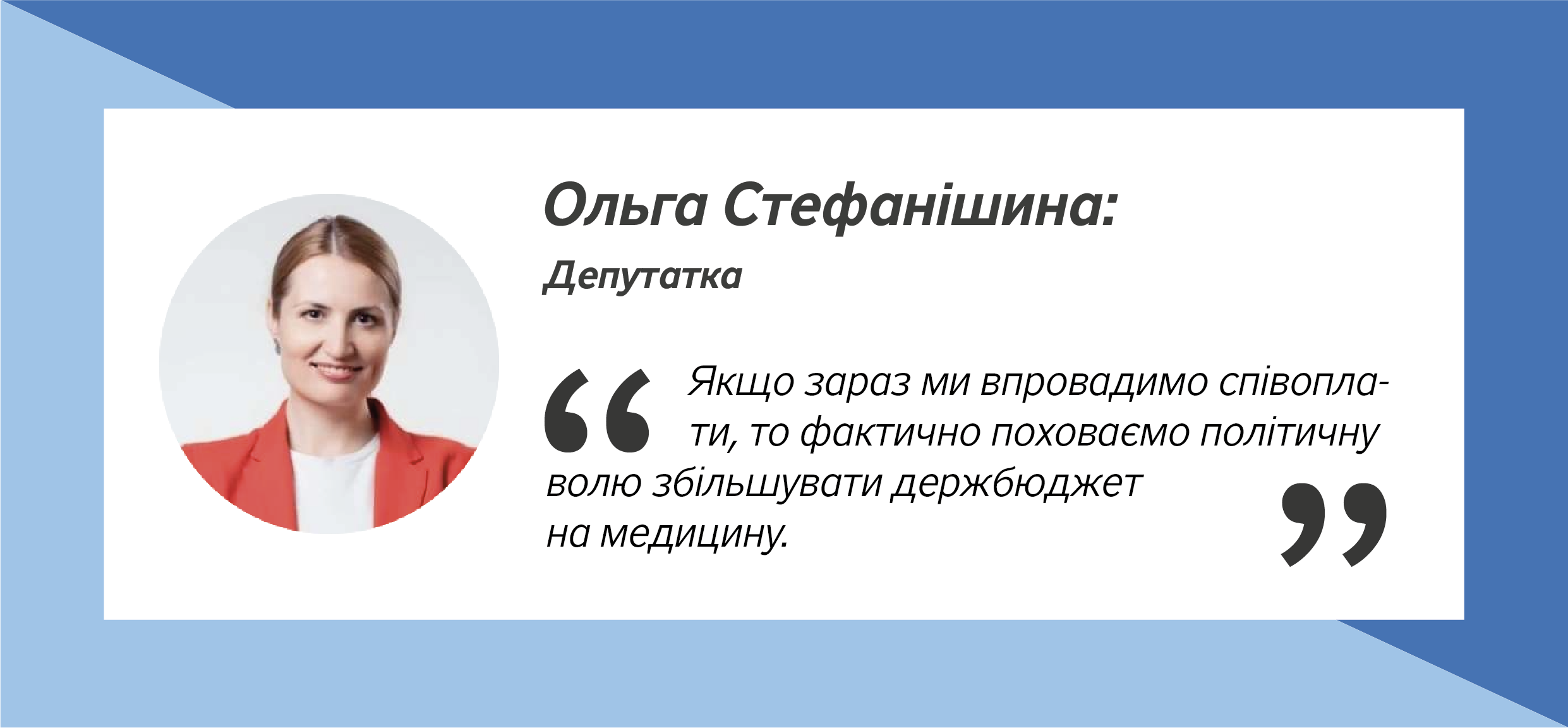 І депутатка Ольга Стефанішина: «Якщо зараз ми введемо співоплати, то фактично поховаємо політичну волю збільшувати держбюджет на медицину».