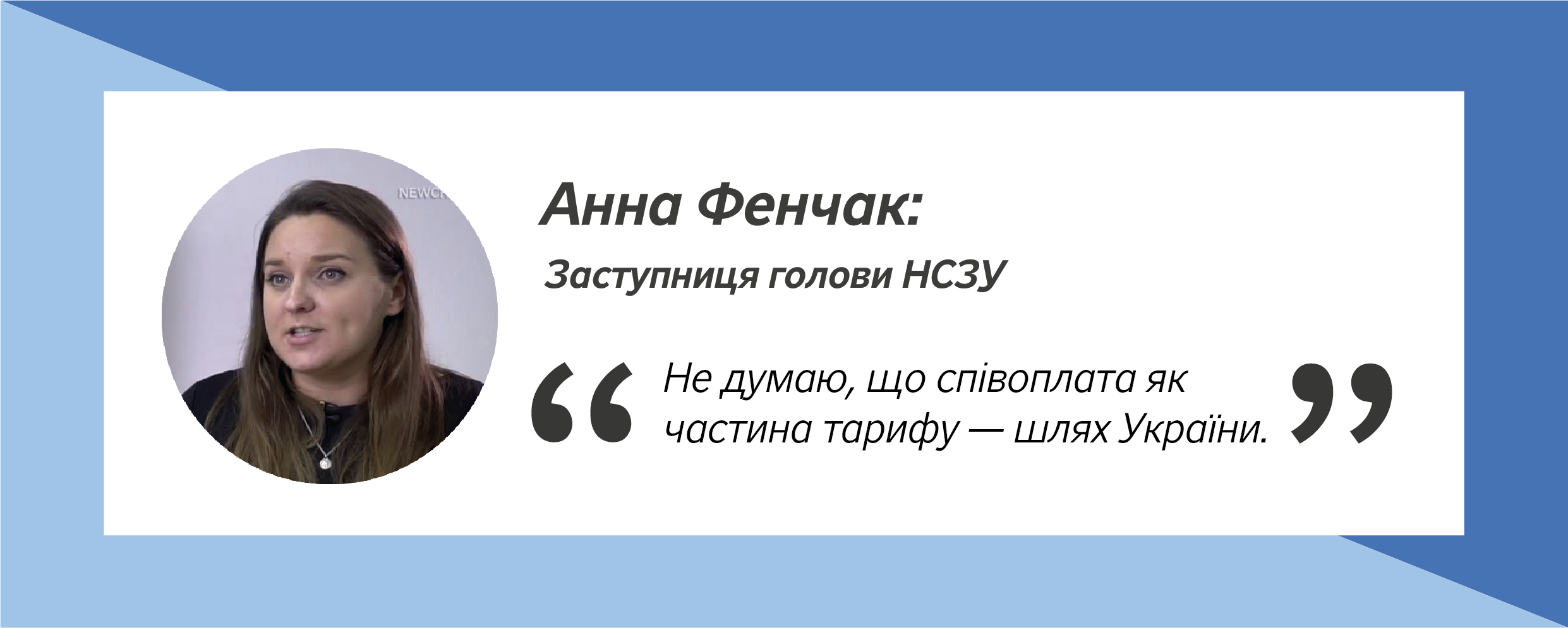 Їм заперечують заступниця голови НСЗУ Анна Фенчак: «Не думаю, що співоплати як частина тарифу – шлях України».