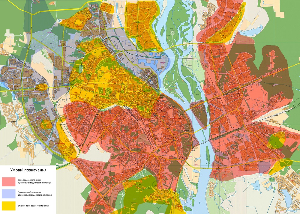 Зона водозабезпечення Деснянської водопровідної станції позначена на карті рожевим кольором: