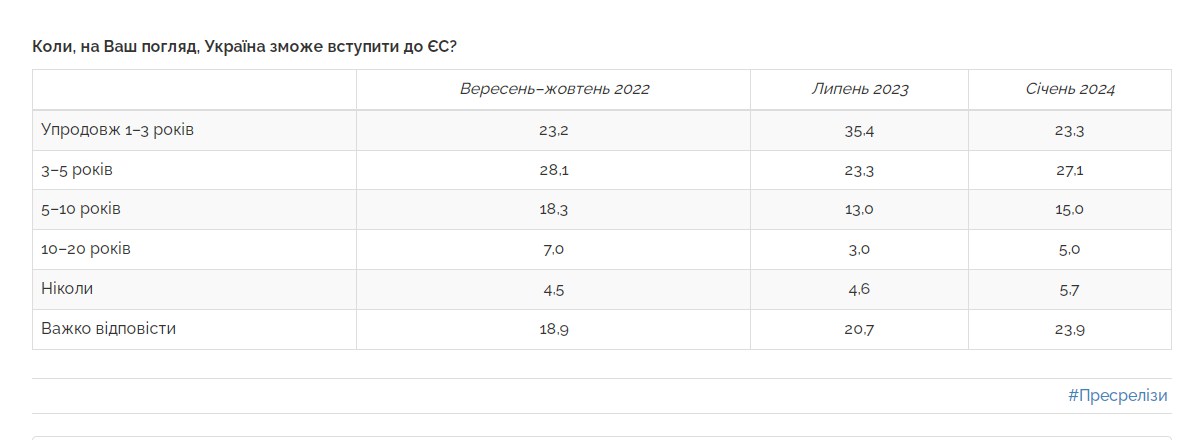 6% респондентів вважає, що Україна не зможе долучитись до ЄС ніколи.
