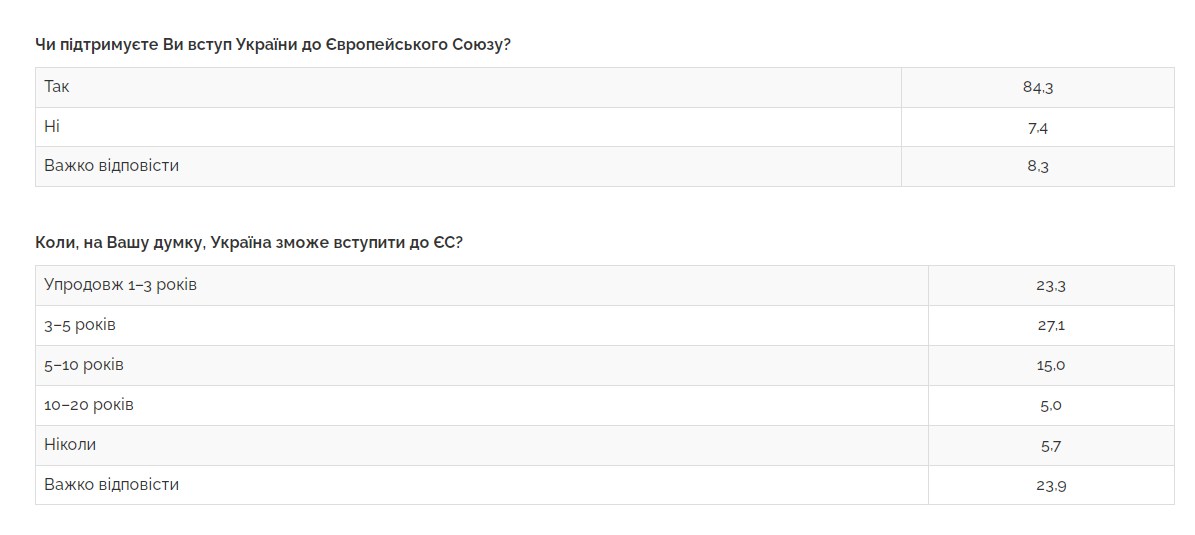 Оцінка того коли Україна долучиться до складу країн ЄС коливається від помірного до песимістичного сценарію. “23% опитаних вважають, що Україна зможе вступити до ЄС упродовж 1–3 років, 27% – упродовж 3–5 років, 15% – упродовж 5–10 років, 5% – 10–20 років”, - зазначають експерти Центру Разумкова за результатами дослідження.