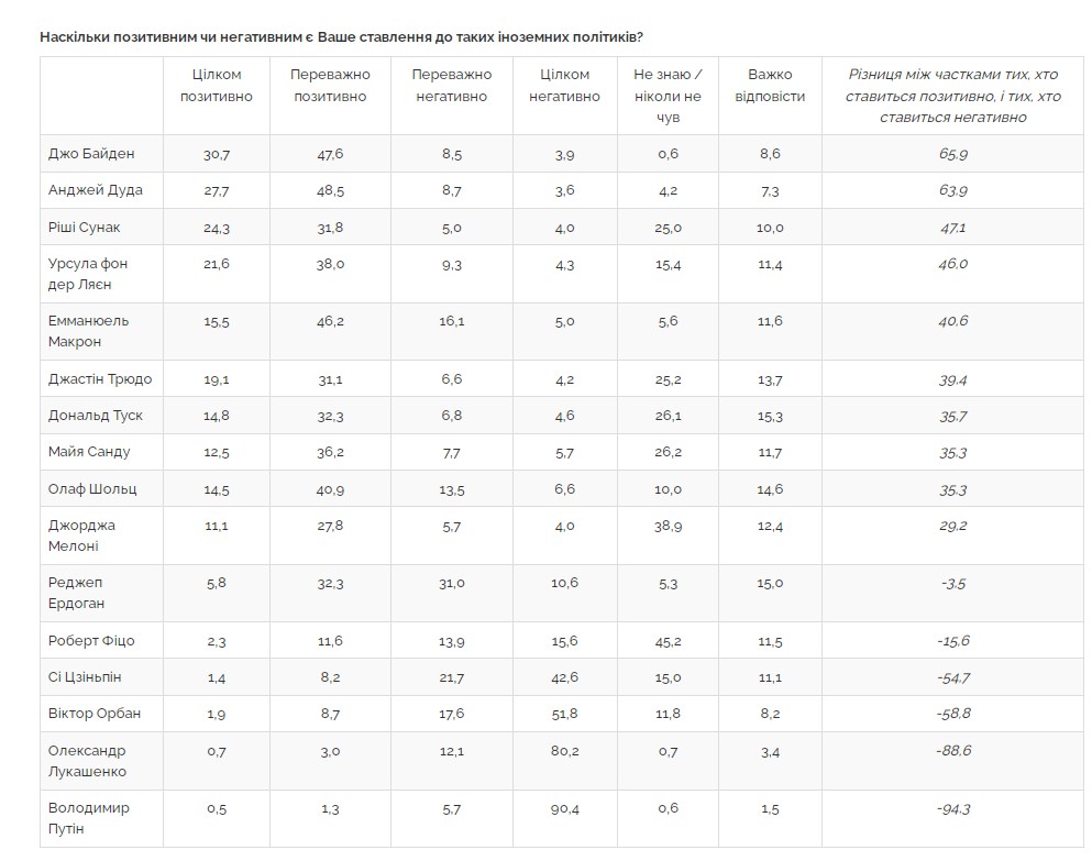 Ставлення до іноземних політиків в Україні корелюється зі ставленням до самої країни та кількості публічних позитивних кроків щодо держави. “Більшість опитаних висловлюють позивне ставлення до Джо Байдена (78%), Анджея Дуди (76%), Емманюеля Макрона (62%), Урсули фон дер Ляєн (60%), Ріші Сунака (56%), Олафа Шольца (55%), Джастіна Трюдо (50%). Відносна більшість опитаних висловлюють позитивне ставлення до Майї Санду (49%), Дональда Туска (47%), Джорджи Мелоні (39%)”,