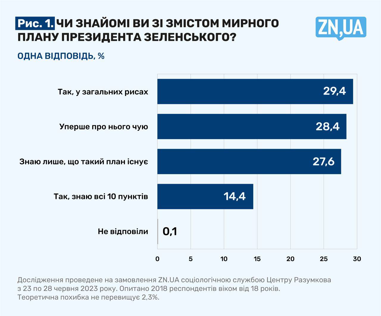 Знайомими зі змістом мирного плану «загалом» виявилися 29,4% респондентів. І лише 14,4% українців заявили, що знають усі його 10 пунктів.