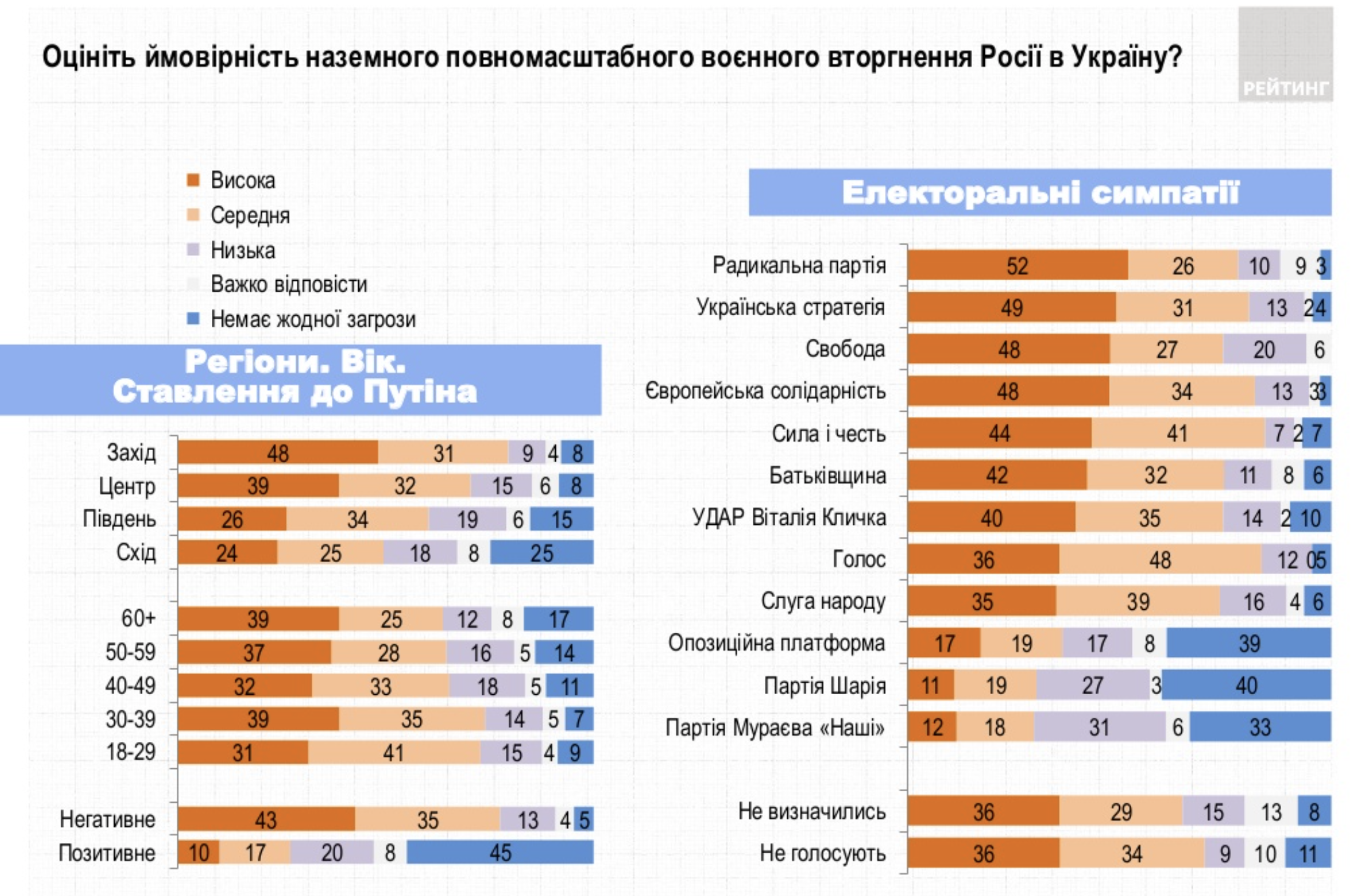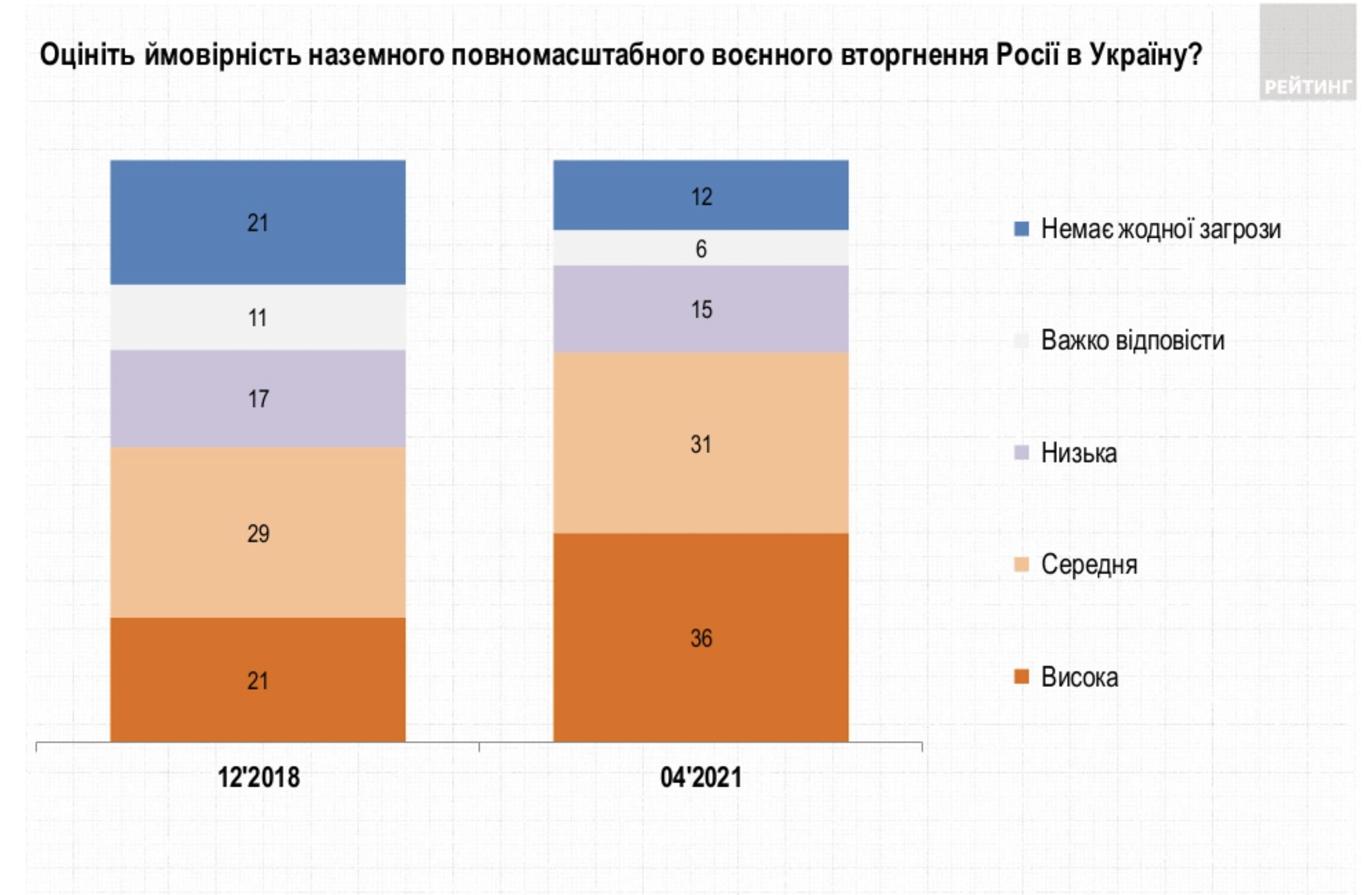 Третина українців (36%) вважає, що імовірність повномасштабного воєнного вторгнення РФ в Україну є високою, свідчать результати опитування Соціологічної групи "Рейтинг".
