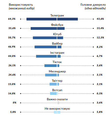 Головну роль займає Telegram, який 64% респондентів використовують для отримання новин, а 44% взагалі називають його головним джерелом інформації.