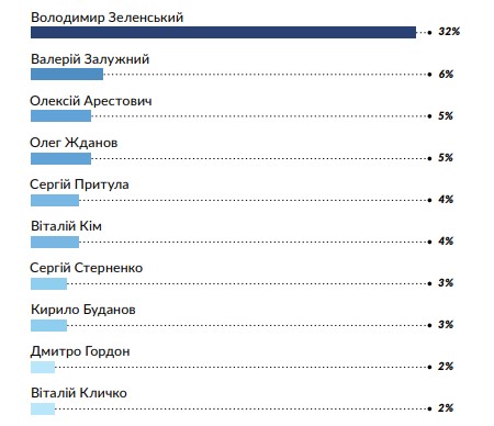 Серед офіційних осіб, експертів, військових, фронтовиків, журналістів волонтерів тощо найбільше впливають на сприйняття ситуації в Україні дані від Володимира Зеленського, головнокомандувача Валерія Залужного, ексрадника ОП Олексія Арестовича та військового експерта Олега Жданова.