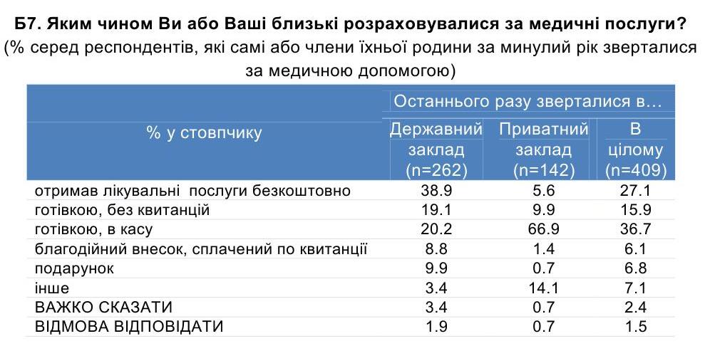 Більшість киян (56%), які зверталися до державних медичних закладів, платили за отримані послуги (готівкою за квитанцією чи без неї, благодійний внесок, подарунок), свідчать дані опитування КМІС.