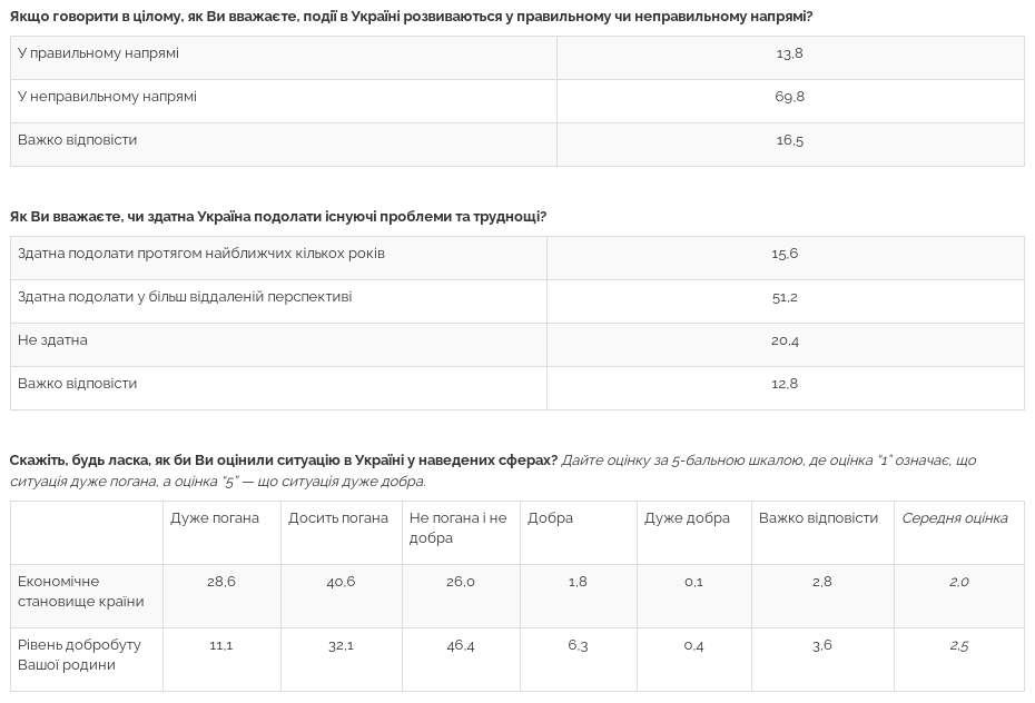 Крім того, 16% опитаних вважають, що Україна здатна подолати існуючі проблеми та труднощі протягом найближчих кількох років, 51% — що вона здатна їх подолати у більш віддаленій перспективі, а 20% — що не здатна їх подолати.