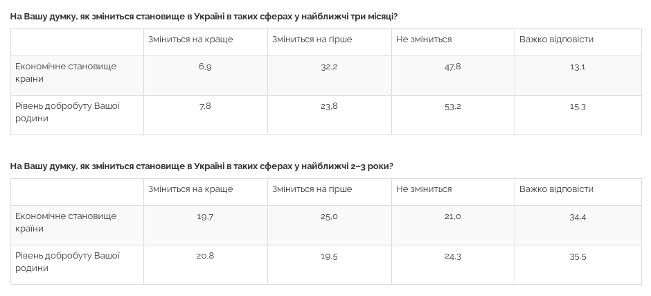 Однак набагато частіше громадяни очікують лише погіршення ситуації: 32% вважають, що у найближчі три місяці економічне становище країни зміниться на гірше, 24% — що за цей час зміниться на гірше рівень добробуту їхньої родини. Однак найбільш поширена думка, що ситуація за три місяці істотно не зміниться (відповідно 48% і 53% не очікують змін у цих сферах).